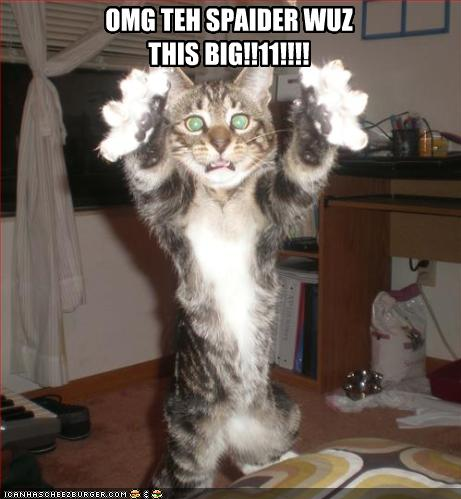 Image Source: http://gallery.gosi.at/d/16869-1/funny-pictures-cat-saw-a-really-big-spider.jpg“This is adorable,” I started telling Alan as we ventured up the walk, approaching the house. I was interrupted as he looked up and – covering his head as if it were about to be struck by a meteor – said, “Holy shit!” And there, descending on an invisible line, was THE LARGEST SPIDER I’ve seen in my life. I may or may not have screamed, right as our host opened the front door.