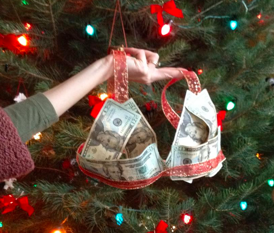 So I put it on my list. And my clever sister gave me the nudge to get it done: For Christmas, her gift to me was a bra made out of $20’s and ribbon, along with directions to Coup de Foudre, an upscale lingerie store in downtown DC. How awesome is that? Here’s her handiwork: