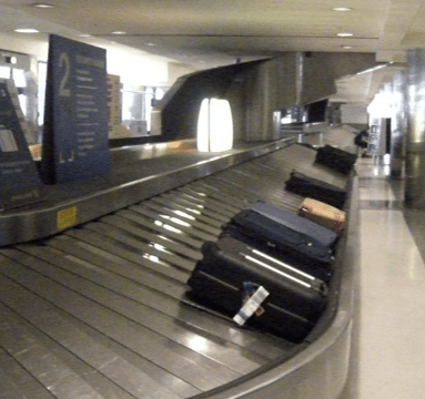 [Luggage carousel screeches into motion and bags begin tumbling off conveyor belt.]