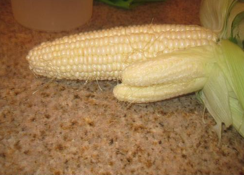 I sized up the corn and selected an ear, peeling a small bit of the husk down about half an inch so I could look at the kernels.