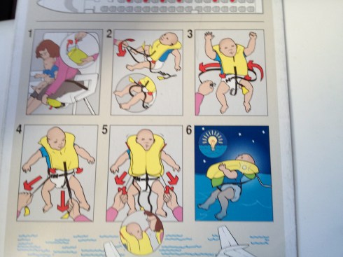 OK. So first… Sorry, but if we’re crashing, who is going to have this much time to fasten a life vest on their child. This looks more complicated than making an origami swan with tinfoil and step-by-step directions.
