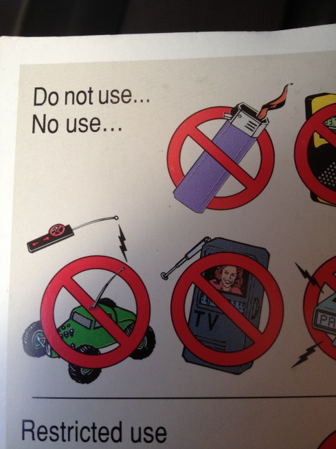 So a few thoughts on this one. First – You had me at “Do not use.” The additional, “No Use” seems unnecessarily insulting. If you’re going to write it twice, why not add, “Stupid!” at the end of it? Second, while I’m glad people can’t use lighters and female transformers are forbidden, I am a bit bummed. Why can’t I use my remote control dune buggy? When I packed, that was my plan for in-flight entertainment. Assholes.